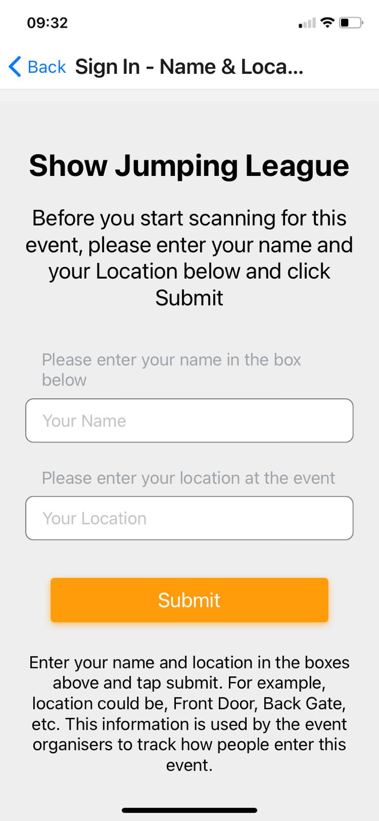 The last step in logging in is to provide your name and location, e.g, if there are multiple entry points to your event, then just type the name of the entry point you are located at and where you will be scanning tickets from, e.g. front gate, back gate etc.