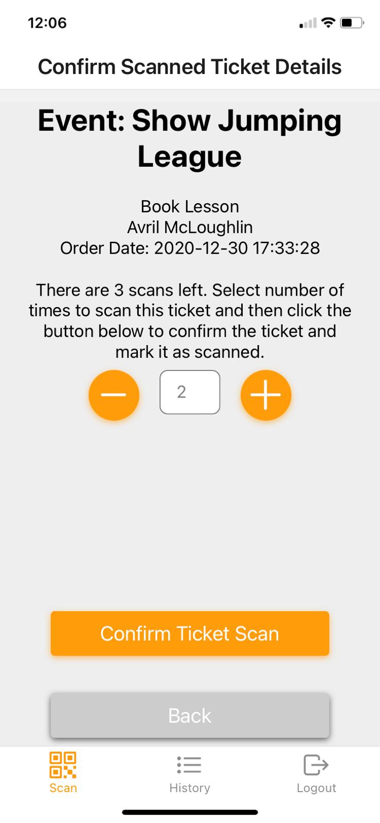 For multi-use tickets, when they are scanned on the App, you are presented with the option to indicate how many scans you would like to record against the ticket at that point in time. For example, if a Ticket Type supports up to 5 scans, and two people are being scanned in with the ticket at a specific point in time, then you would set number of Scans to 2, and then click the Confirm Ticket Scan button.
