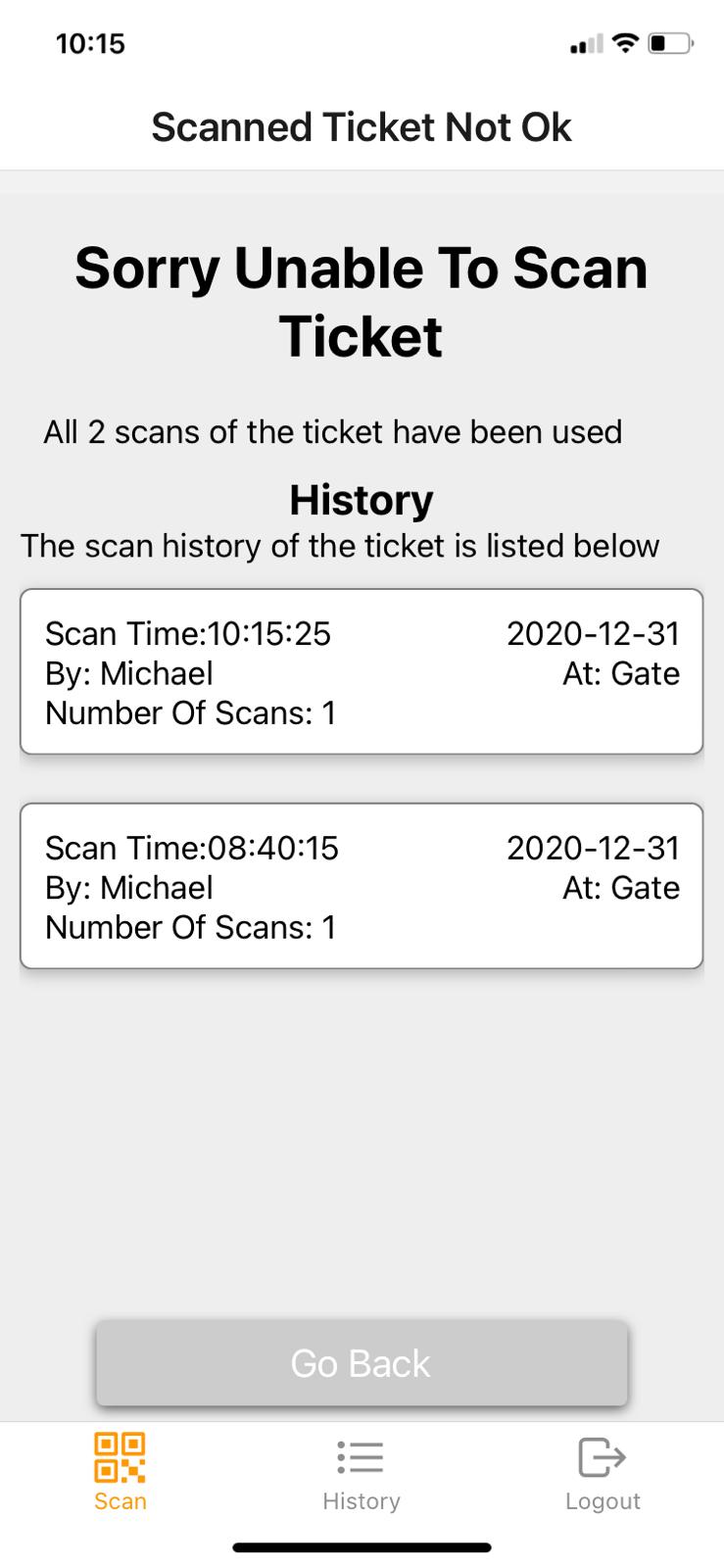 Note 2 - if the ticket is invalid, or if the ticket has already been used/ scanned, then an error message will be displayed, see example screen below, where the history of the ticket is displayed showing where and when the ticket has already been used.